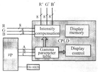為了補償LED 因溫度引起的亮度變化,LED 顯示係統增加了亮度檢測電路。實驗發現,以20 ℃溫度間隔對色彩進行溫度補償時,能基本上滿足圖像的觀看質量。為此,係統以常溫為基礎,每隔20 ℃給出相應基色的Gamma 校正參數。對於- 20 ℃~ + 80 ℃範圍,每個基色給出供5 種不同的Gamma 參數以補償亮度的變化。圖6 給出係統的溫度檢測電路和相應的控製Gamma 參數的電路框圖。利用溫度傳感器DS18B20檢測環境溫度的變化,當環境溫度到達設定溫度值時,通過微處理器的ARC 3 個I/ O 線輸出5 個溫度狀態中的某一狀態值給CPLD。在CPLD 內部設有RGB 三基色(3 ×4 + 1 = 13)13 個(常溫時采用一個標準的Gamma 參數校正,在其他溫度下,每個基色一個校正參數) Gamma 值的參數表,從表查出分別對應RGB 的3 個Gamma 值提供給亮度控製電路和顯示控製電路。