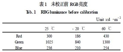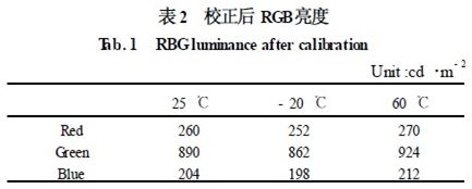 表1 中,常溫的白場配色比例為1. 92 ∶6. 57 ∶1. 51。而當溫度發生變化時,由於LED 的特性,使RGB 的亮度特性發生了嚴重的偏移,使白場的比例已完全偏離了常溫下的比例,使圖像在色彩發生了畸變。而采用本文的校正技術後,結果如表2 所示。