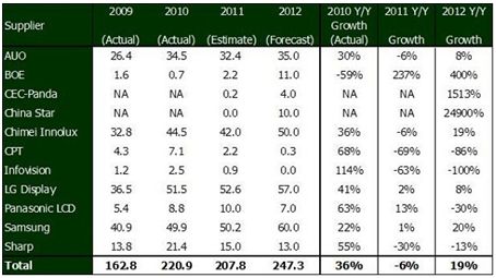根據 DisplaySearch 最新的報告MarketWise – LCD Industry Dynamics顯示,2011年台灣、日本、韓國以及中國大陸的液晶電視麵板廠商出貨預計為2億780萬片;相較於2010年的2億2,000萬片衰退了6%,這也將是液晶產業發展有史以來第一次麵板的年出貨數量較前一年度衰退,但也代表了液晶電視麵板在今年整年度的庫存調整狀況。