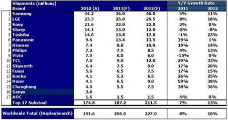 然而DisplaySearch針對全球前十五大主要品牌包含Samsung、LGE、Sony、Sharp、Toshiba、 Panasonic、Vizio等等的最新調查數據顯示; 2012年主要品牌均寄望於全球景氣的複蘇與液晶電視購買的需求恢複,而設定了積極的銷售目標;合計前十五大廠商 2012年的出貨目標將相較於 2011年成長13%以上。