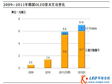 做為全球發展OLED最積極地區,韓國除三星行動顯示器(SamsungMobiLEDisplay;SMD)逐年擴大投資AMOLED麵板外,LGDisplay(LGD)亦自2011年起正式展開AMOLED麵板投資計畫,於此背景下,2011年韓國OLED資本支出將為5.9兆韓元(約52億美元)規模,且2012年更將上看8兆韓元(約72億美元)。