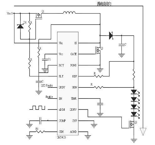 美國國家半導體研發的LM3423 芯片輸入電壓範圍在4.5V 到75V之間,適用於極寬的輸入電壓範圍;50KHZ 的快速PWM調光;內部基準電壓50mV- 1.25V;工作頻率最大可達到1MHZ;內部驅動能力750mA,超低電流停機小於2uA.可以用來配置升壓、浮動降壓、浮動降壓/ 升壓和SEPIC 拓撲結構中低側外部MOSFET的控製器;使用峰值電流模式控製器和預測性關閉時間設計來調節LED 電流,峰值電流模式控製器與預測性關閉時間設計的組合簡化了回路補償設計,同時提供內在的輸入電壓前饋補償;設有用於控製外部調光FET 和係統"零電流"關閉特點的集成驅動器;並且具有LED 狀態輸出標記、故障標記、可編程故障計時器和邏輯針腳,用於控製調光驅動器的極性。