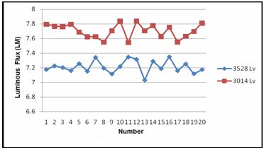 隨機選取3014LED和3528LED各20個,其光通量和色溫如圖9、圖10所示,橫坐標表示LED個數,縱坐標表示光通量和相關色溫CCT。