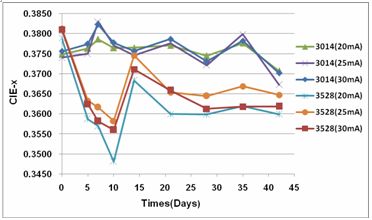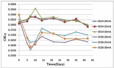 隨機抽取3528LED和3014LED各30pcs,按驅動電流20mA、25mA、30mA各分為三組進行1008H的光衰實驗,以比較分析兩種不同散熱模式LED的光衰和色坐標漂移程度,從而研究散熱對其光色特性的影響。