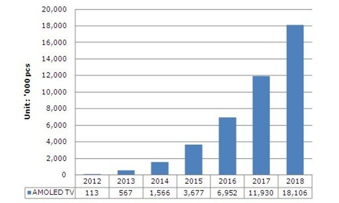 據NPD DisplaySearch分析,2011年OLED麵板產值預計達40億美金,約為所有平板顯示器產值的4%;2018年則將創造超過200億美金產值,達到了所有平板顯示器產值的16%?此外, OLED應用在照明上也自2011年開始起飛,OLED照明預計到2018年將達到60億美金產值。NPD DisplaySearch預測 AMOLED TV將於2017年達到1千萬台以上的規模。雖然在AMOLED TV麵板量產初期會有規模經濟不夠、量產穩定性不夠以及成本過高等問題,但在電視品牌廠商追求產品差異化的動機之下,預計將會有策略性的AMOLED TV訂價方式,以刺激終端市場消費者的購買動機。