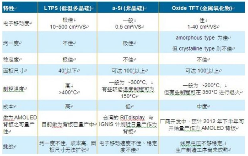 表一、LTPS、Oxide與a-Si 背板特性比較:
