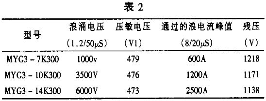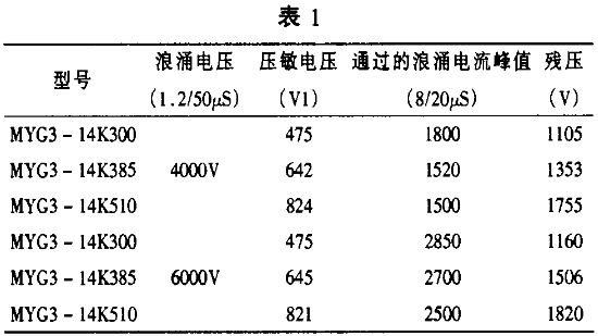 另外,表2 為一組Ф7、Ф10 或Ф14 等deng不bu同tong片pian徑jing的de壓ya敏min電dian阻zu器qi通tong流liu試shi驗yan情qing況kuang,從cong表biao中zhong可ke以yi看kan出chu,對dui於yu不bu同tong片pian徑jing的de壓ya敏min電dian阻zu器qi,其qi所suo能neng承cheng受shou的de浪lang湧yong電dian流liu也ye不bu一yi樣yang。通tong常chang,對dui於yu使shi用yong同tong一yi配pei方fang製zhi作zuo的de壓ya敏min電dian阻zu器qi,片pian徑jing越yue大da,壓ya敏min電dian阻zu器qi能neng承cheng受shou的de最zui大da峰feng值zhi電dian流liu也ye就jiu越yue大da,相xiang應ying的de殘can壓ya也ye會hui有you所suo增zeng加jia,但dan其qi增zeng加jia的de程cheng度du遠yuan遠yuan低di於yu通tong流liu的de增zeng加jia幅fu度du。因yin此ci,選xuan型xing時shi,應ying根gen據ju線xian路lu的de耐nai壓ya水shui平ping,外wai界jie可ke能neng產chan生sheng的de電dian湧yong電dian壓ya,盡jin可ke能neng選xuan擇ze通tong流liu比bi較jiao大da的de壓ya敏min電dian阻zu器qi,以yi保bao證zheng線xian路lu長chang期qi持chi續xu的de正zheng常chang工gong作zuo。