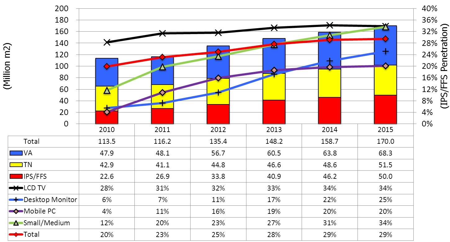 在中小尺寸麵板市場,IPS/FFS LCD麵板持續被使用在智能型手機、數碼相機、車用顯示器、攝錄像機及平板計算機上,。因為這些應用需要高影像質量來展現相片及影片。因此NPD DisplaySearch預期IPS/FFS在這些市場滲透率將持續提高。