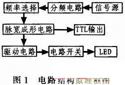 對水下成像係統而言,光源的選擇至關重要,光源的穩定性、均勻性、響應速度及其光波波長範圍是係統成像的關鍵。采用藍光LED所發出光光經過水介質——目標反射——水介質——接收光學係統,最終在成像傳感器(CCD,ICCD)上成像。這就決定了LED必須工作在快脈衝驅動方式下,目前市場上的驅動電路一般均丁作在慢脈衝驅動模式(μs量級),遠不能滿足我們的要求。因此,我們必須自己解決快脈衝驅動電路這一難題,尤其是實現以ns量級的大功率快脈衝來驅動大功率的LED。基於這種實驗實際需求,我們研究開發了此種快脈衝驅動電路。該電路的基本功能是產生低頻、快速、大功率驅動電流脈衝信號,輸出脈衝的頻率與周期精確度高,穩定性好,脈衝信號寬度在20~100 ns內分5檔可調,輸出在50 Hz的基準頻率下工作。脈衝信號通過驅動電路,輸出一個快脈衝信號驅動輸出電流開關,產生一個大電流脈衝信號驅動一個大功率LED。為了達到設計要求和目的,我們采用晶振電路產生高精度頻率/zhouqijizhunmaichongzuoweineizhixinhaoyuan,tongguoduijizhunmaichongjinxingduocifenpin,chanshengsuoxupinlvdeshuchumaichongxinhao,zheyangkeyihuodepinlvwendingdemaichongxinhao,tongshishixianlepinlvxuanze。jingguofenpinhoudemaichongxinhaozaijingguomaichongkuanduchengxingdianlushixianmaikuantiaojie,ranhoujingguodianliukaiguandianlu,chanshengdadianliumaichong,shiLED發光。該驅動電路主要由以下幾個部分組成:信號源、分頻電路、頻率選擇、脈衝寬度電路、TTL輸出、驅動電路和電流開關電路。其框圖如圖1所示。