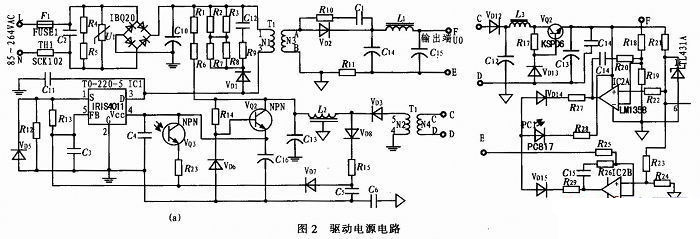 基於IRIS4011的電路由輸入保護電路,EMI抑製電路,輸入整流濾波電路,直流變換電路,輸出濾波電路,輔助供電電路,二次恒壓/恒流反饋電路組成。輸入電壓:85~264 VAC;輸入頻率47~63 Hz;輸出電壓5~24 VDC;輸出電流2.5 A;恒流精度±2.5%;最大輸出功率:60 W。利用變壓器的電感與瓷片電容實現準諧振工作模式,電路簡單,可靠性高。準諧振控製模式,能提高電路的轉換效率,降低EMI幹擾。用放大器來實現恒壓、hengliukongzhi,keyidedaohengaodekongzhijingdu。zaishuchudianliubijiaodadedianluzhong,bixuyongfangdaqikongzhixingshicainengtigaokongzhijingduyutigaodianluzhuanhuanxiaolv。xianyupianfu,badianlutufencheng2部分,具體的電路如圖2所示。
