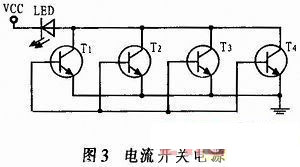 通過成形電路的信號,控製大功率藍光LED發光,驅動信號控製電流開關。電流開關選用一種大功率高頻三極管,為了滿足LED驅動電流的需求,將4隻三極管並聯,使流過LED的脈衝電流最大達到2.5 A,保證了LED在額定功率下工作,達到穩定光源的目的。在輸入驅動信號的作用下,三極管進入導通狀態,LED兩端產生一定的壓降,大電流流過LED,使大功率藍光LED發光,作為距離選通水下成像係統的光源,電路如圖3所示。