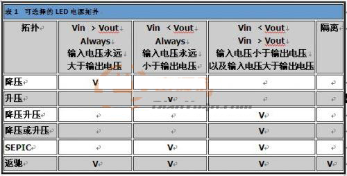 表1的信息可供作選擇LEDqudongqizuijiaqiehuantuopudecankao。chulezhexietuopuzhiwai,yekeyishiyongjiandandedianliuxianzhidianzuhuoshixianxingwenyaqi,buguozhexiefangfatongchanghuihaoyongguoduogonglv。shurudianyafanwei、驅動的LED數目、LED電流、隔離、電磁幹擾(EMI)限製以及效能,都是相關的設計參數。大部分的LED驅動電路可分為以下幾種拓撲類別:降壓、升壓、降壓升壓、SEPIC以及返馳。