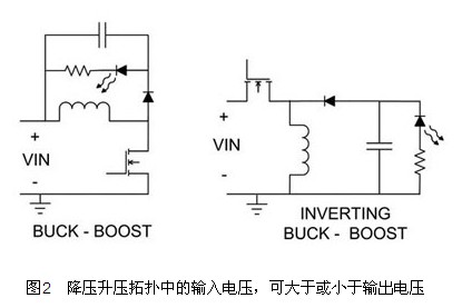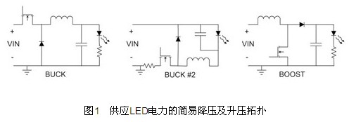圖1顯示三個基本電源拓撲的例子,第一張圖所顯示的降壓穩壓器,可使用於輸出電壓永遠小於輸入電壓的情形。圖1中,降壓穩壓器改變金屬氧化半導體場效晶體管(MOSFET)的導通時間,以控製進入LED的電流。可越過電阻測量電壓以進行電流偵測;電阻與LED為串聯狀態。驅動MOSFET是本方法在設計上的重大挑戰,如果從成本及效能的觀點來看,建議使用須要浮接閘極驅動的N信道FET。N信道FET須要使用驅動變壓器或是浮動驅動電路,兩者都可維持電壓高於輸入電壓。