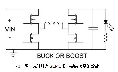 如(ru)果(guo)輸(shu)入(ru)與(yu)輸(shu)出(chu)電(dian)壓(ya)幾(ji)乎(hu)相(xiang)同(tong),則(ze)此(ci)電(dian)路(lu)所(suo)擁(yong)有(you)的(de)有(you)利(li)條(tiao)件(jian),就(jiu)是(shi)開(kai)關(guan)與(yu)電(dian)感(gan)電(dian)流(liu)幾(ji)乎(hu)等(deng)於(yu)輸(shu)出(chu)電(dian)流(liu),電(dian)感(gan)鏈(lian)波(bo)電(dian)流(liu)也(ye)會(hui)有(you)較(jiao)少(shao)的(de)傾(qing)向(xiang)。即(ji)使(shi)此(ci)電(dian)路(lu)中(zhong)有(you)四(si)個(ge)功(gong)率(lv)開(kai)關(guan),通(tong)常(chang)仍(reng)有(you)顯(xian)著(zhu)的(de)效(xiao)能(neng)增(zeng)進(jin)現(xian)象(xiang),這(zhe)是(shi)電(dian)池(chi)應(ying)用(yong)的(de)關(guan)鍵(jian)所(suo)在(zai)。圖(tu)3所顯示的SEPIC拓撲所需的FET較少,但是需要更多被動組件。SEPIC拓撲的優勢,在於簡易的接地參考FET及控製電路。此外,雙通道電感可以結合為單耦合電感,節省麵積與成本。不過和降壓升壓拓撲一樣,SEPIC拓撲的開關電流較「降壓或升壓」及脈衝輸出電流為高,需要能處理大量RMS電流的電容器。