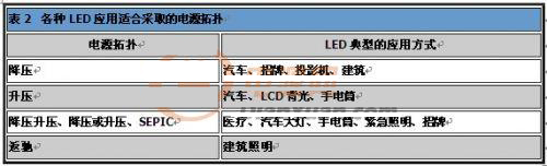 如同表2所示,LED已廣泛運用於各領域,因此需要許多種類的電源拓撲,支持LED的應用。一般而言,必須考慮輸入電壓、輸出電壓及對隔離的需求,以做出適當選擇。