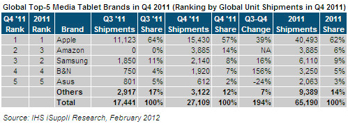 2011年全年,蘋果iPad出貨量為4050萬台,比2010年增長168%,不過市場份額從2010年的87%下降到62%。三星全球年出貨量為611萬台,市場份額為9%。亞馬遜Kindle Fire隻在第四季度上市,因此全年市場份額隻有6%。邦諾的Nook和華碩分列第四和第五,市場份額分別為5%和3%。