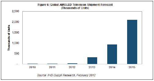 據IHS iSuppli公司的中小顯示器研究報告,2015年全球AMOLED電視出貨量預計將達到210萬台,而2012年隻有3.4萬台。雖然增幅巨大,但到2015年AMOLED電視在全球平板電視市場中的份額仍然將隻有1%。