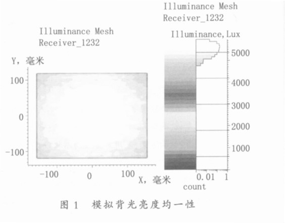 采用STAMPER 技ji術shu,一yi體ti成cheng型xing射she出chu導dao光guang板ban,減jian少shao印yin刷shua環huan節jie,較jiao少shao印yin刷shua汙wu染ran。以yi模mo具ju射she出chu形xing成cheng網wang點dian,入ru射she麵mian設she計ji能neng破po壞huai光guang源yuan的de全quan反fan射she,並bing控kong製zhi光guang源yuan射she出chu導dao光guang板ban麵mian角jiao度du的de分fen布bu,網wang點dian數shu量liang的de多duo少shao對dui光guang源yuan做zuo有you效xiao的de控kong製zhi。網wang點dian可ke隨sui模mo具ju任ren意yi設she計ji形xing狀zhuang,若ruo網wang點dian為wei極ji小xiao的de平ping滑hua鏡jing麵mian,可ke使shi光guang在zai網wang點dian及ji導dao光guang板ban內nei部bu的de損sun失shi減jian至zhi最zui小xiao,應ying用yong光guang學xue設she計ji軟ruan件jian進jin行xing網wang點dian設she計ji。圖tu1 所示為模擬的背光組件的亮度均一性。