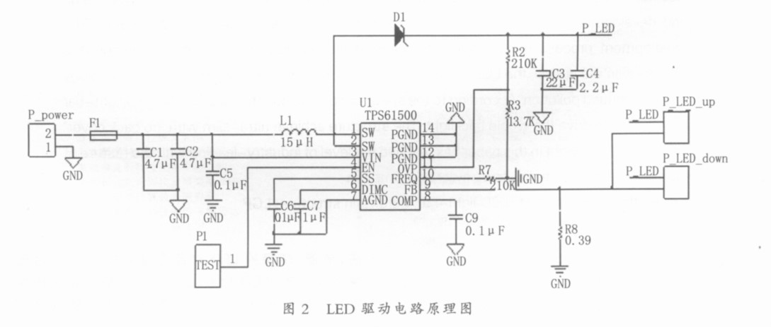 在側光式背光組件中, 應用長條式的LEDlight- bar 作為整個組件的光源,LED light- bar 采用白光頂發光LED.以某機種產品為例,單顆功耗:3.2V×0.02A=0.064W.整個light- bar 功耗:0.064W×42=2.69W.LED 背光源電路設計主要包括發光條設計和驅動控製電路設計,驅動電路采用一款DC/DC 恒流驅動芯片,對發光條進行恒流驅動。圖2 所示為LED light- bar 的驅動原理圖。