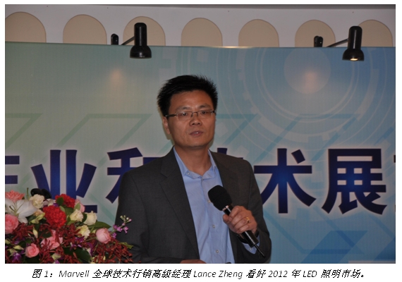 有業內人士說,2011年LED庫存過大,會使2012年的市場不如2011年。對此觀點,Marvell公司全球技術行銷高級經理Lance Zheng有不同看法,“國內裝機量非常多,這個是造成產能過剩的原因,但提高光效會是刺激LED行業發展的非常好的方式,因為光效一提高所用的LED數量就會小,因此能降低成本,促進LED市場發展。至於說2012年整個產業應該還是保持增長,這裏的亮點就是LED照明。”他在“2012產業和技術展望媒體研討會”上這樣表示。