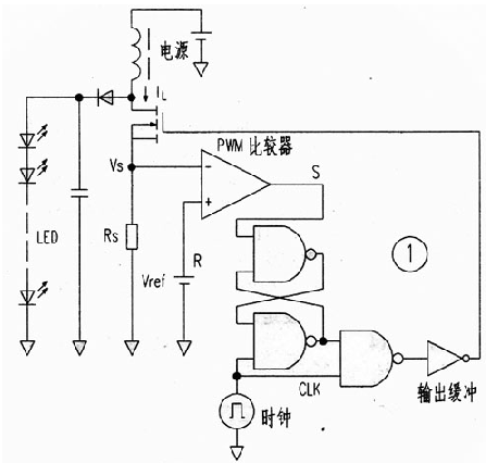圖1是這種驅動電路的方框圖,它省略了傳統電路的三角波發生器和誤差放大器,而使用了CM0S邏輯IC和PWM調製器。當時鍾CLK信號為低電平時,RS觸發器處於複位狀態,輸出FET關斷。而當CLK信號為高電平時,輸出FET導通。其電流被電阻Rs轉換成電壓,當此電壓高於基準電壓Vref時,比較器輸出由高變低,RS觸發器又被複位,輸出FET再關斷。其結果,即使電源電壓有變化,儲存在電感中的能量卻是恒定的。實現了恒功率輸出。這裏是把Rs上的電壓降作為三角波電壓,PWM比較器將此電壓與基準電壓直接比較而起到了誤差放大器的作用。