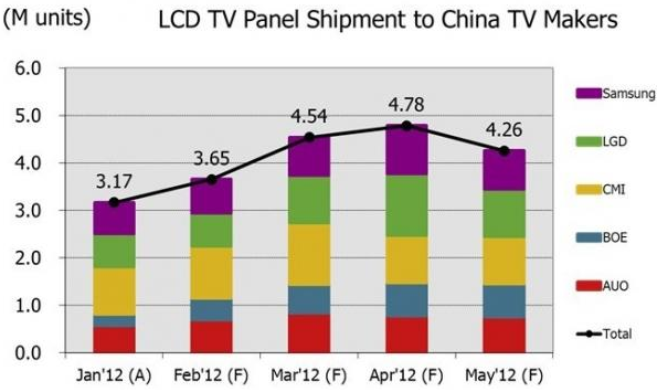 圖一、Jan’12-May’12電視麵板出貨至大陸電視廠商的數量