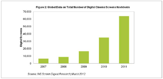 據IHS公司的最終數據,2011年全球數字影院屏幕大增到接近6.4萬塊,比2010年底時的35070塊猛增82%。2011年全球淨增數字銀幕創下迄今為止的最高水平,達到28756塊,遠遠超過了2010年創下的紀錄18698塊。