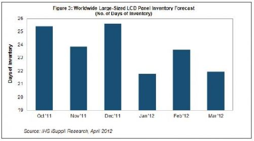 - 大尺寸LCD麵板的庫存從2月時的23.6天降到22.0天