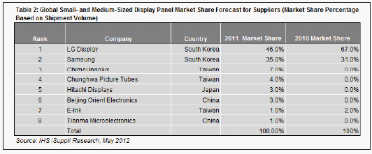 據IHS iSuppli公司的中小顯示器市場追蹤報告,LG顯示器和三星顯示器去年是火爆的平板產品市場的最大顯示器麵板供應商,合計占有超過80%的出貨量份額。