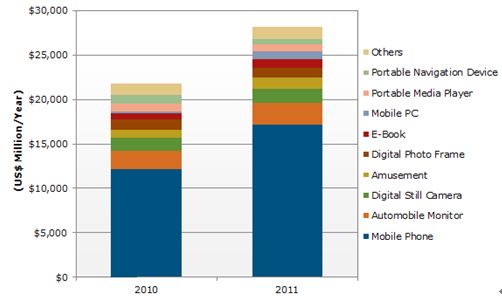 - 應用於手機的主動矩陣式顯示器的出貨量增加到2011年的15億台