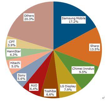 一如預期,三星移動顯示器(SMD)再次維持其領先的地位,在2011年市占率達到17.2%,主要來自於AMOLED在智能手機市場應用的提高。緊隨其後的是夏普和奇美, 2011年市占率分別為13.5%和9.5%。