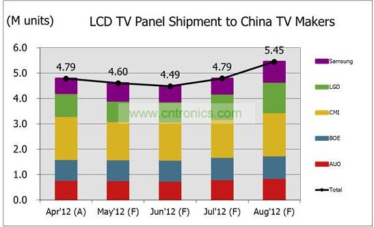 圖一、2012年4-8月出貨至中國本土廠商電視麵板按供貨商數量走勢