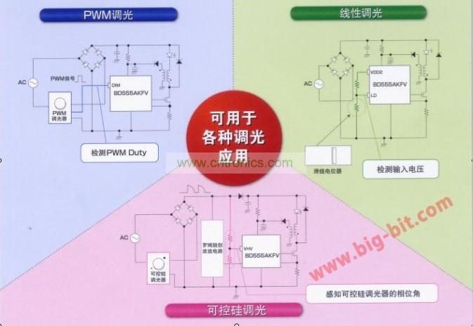 其主要特點是:可進行可控矽/PWM/線性調光。適用於各種調光應用(調光比0.2%-100%);內置緩衝功能,照度變化平穩(可選擇有緩衝、無緩衝);通過LED平均電流控製,可針對輸入電壓、輸入電壓變化,控製相應的LED電流。這種對應可控矽調光的LED照明用驅動IC可用於兼容調光器的燈泡型LED照明、兼容調光器的LED筒燈照明和兼容調光器的LED基礎照明。