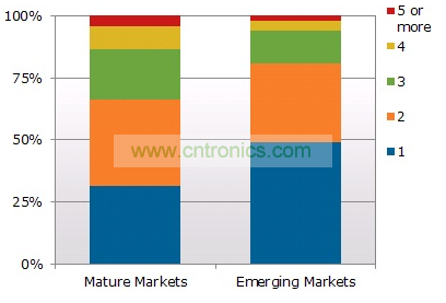 該報告還發現,在成熟市場家庭平均擁有2.4台電視,而在新興市場平均每戶為1.8台。成熟市場中,超過三分之二的家庭有一台以上電視,但在新興市場近一半的家庭隻有一台電視。鑒於平板電視持續推出新機種、價格益加實惠、以及消費者對高品質、大屏幕和高清晰度電視的消費欲望,和成熟市場的消費者一樣,越來越多的新興市場消費者購買平板電視(主要是液晶電視)來汰換他們現有的舊款式電視。