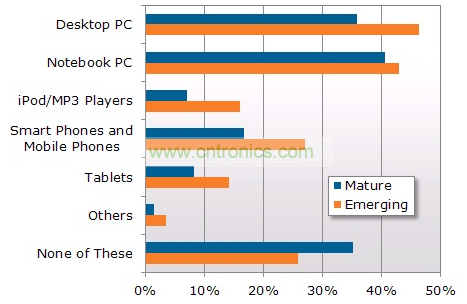 NPD DisplaySearch全(quan)球(qiu)電(dian)視(shi)消(xiao)費(fei)者(zhe)換(huan)機(ji)調(tiao)查(zha)還(hai)對(dui)家(jia)庭(ting)戶(hu)進(jin)行(xing)了(le)關(guan)於(yu)在(zai)其(qi)他(ta)設(she)備(bei)上(shang)收(shou)看(kan)電(dian)視(shi)視(shi)頻(pin)節(jie)目(mu)的(de)調(tiao)研(yan),發(fa)現(xian)在(zai)新(xin)興(xing)市(shi)場(chang)越(yue)來(lai)越(yue)多(duo)的(de)家(jia)庭(ting)使(shi)用(yong)除(chu)電(dian)視(shi)以(yi)外(wai)的(de)設(she)備(bei),包(bao)括(kuo)平(ping)板(ban)電(dian)腦(nao)、智能手機和MP3播放器。