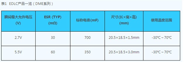 表1為村田製作所的EDLC產品一覽,圖4為使用了村田EDLC的LEDflach演示板。這個係統能在33毫秒內向LED提供最大為8A的大電流。(可控製在2A-8A/10-60毫秒)