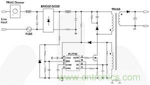 這一架構現在已經用於兩款新的PWM控製器,即可調光 FL7730 PWM 控製器和非調光 FL7732 PWM 控製器。圖2是簡化的應用原理圖,顯示用於TRIAC調光的FL7730器件。