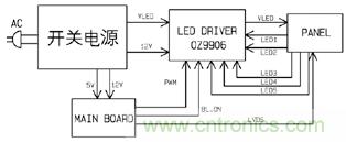 電視顯示係統包括電源板、主板、背光驅動板等, 電源板提供VLED、12V給背光板,主板提供背光控製信號BL_ON和調光PWM信號給背光板。背光驅動ICOZ9906 檢測PANEL內部五條燈條的流過的電流,進行定電流和電流平衡控製,點亮背光係統。