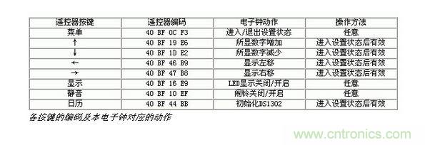 遙控器采用長虹彩電K11F型遙控器,遙控器按照16位地址碼,8位數據碼以及8位數據碼的反碼發送。表一列出了各按鍵的編碼及本電子鍾對應的動作。如果采用其他遙控器,需對程序相應部分的編碼作修改。