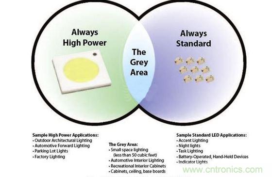 體積較小、通過電池供電或便攜式的設備(例如消費類電子產品、重點照明和標準指示燈等),已經在很長一段時間內使用了標準LED,而且有可能繼續使用。同樣,一些領域將會繼續使用大功率LED技術,包括:一般戶外照明、大麵積的室內照明(軌道燈、燈泡替換物)以及汽車前照燈等。