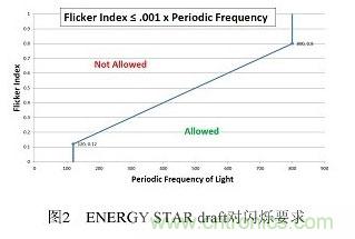 化,人眼到人腦對這一變化產生的主觀反映。通常閃爍按人的感覺分為可見閃爍和不可見閃爍。頻率大於100Hz時,人眼感受不到閃爍現象,但仍會造成眼睛疲勞,頭痛等,這就是頻閃效應。普遍認為500Hz以內都存在該效應。對此,美國能源之星在調光性能的要求中規定了閃爍需滿足的條件,使用於所有燈具。如下圖所示: