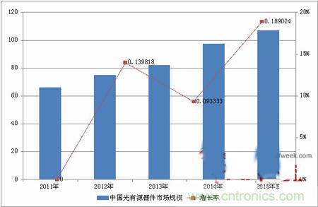 據OFweek行業研究中心出版的《2015-2018年中國光有源器件市場分析及前景預測報告》顯示,2011年-2014年中國光有源器件市場規模增長較快,年複合增長率達到14%。未來幾年會有所放緩,年複合增長率會降至10%左右。2014年中國光有源器件市場規模為97.5億元人民幣,估計2015年將達到107億元。