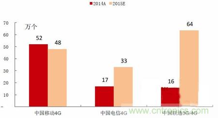圖表3 2014、2015年三大運營商新增4G基站數量(單位:萬個)