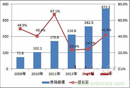 圖表5 2009-2014年中國IDC行業市場規模及增長(單位:億元,%)