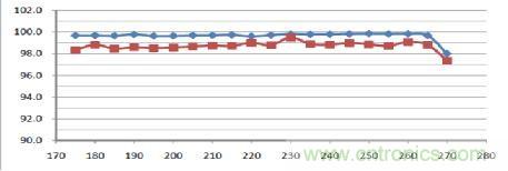 圖中的藍色為恒流源本身的效率,紅色為包括了整流器在內的全部電源的效率。由圖中可見當市電電壓從175V增加到265V時,它的效率一直保持在99%以(yi)上(shang)。這(zhe)樣(yang)高(gao)效(xiao)率(lv)的(de)恒(heng)流(liu)源(yuan),放(fang)到(dao)鋁(lv)基(ji)板(ban)上(shang)以(yi)後(hou)就(jiu)基(ji)本(ben)上(shang)不(bu)會(hui)增(zeng)加(jia)鋁(lv)基(ji)板(ban)的(de)熱(re)量(liang),也(ye)就(jiu)不(bu)會(hui)降(jiang)低(di)光(guang)引(yin)擎(qing)的(de)熱(re)光(guang)效(xiao),更(geng)不(bu)會(hui)降(jiang)低(di)光(guang)引(yin)擎(qing)的(de)壽(shou)命(ming)了(le)!此外它的效率也不隨溫度而變化: