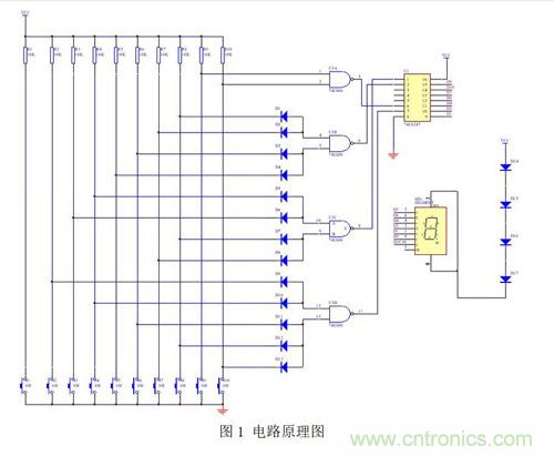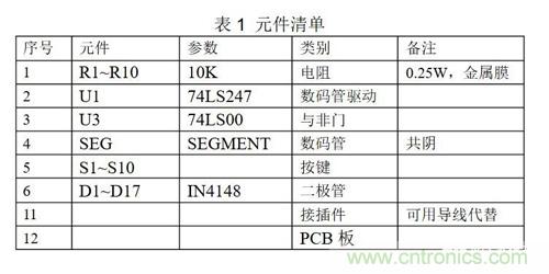 如圖1所示,電路由與非門74LS00、數碼管驅動芯片74LS247組成。10個按鍵組成輸入電路,經過與非門電路編碼後,輸入數碼管驅動芯片,驅動數碼管顯示相應的按鍵號。