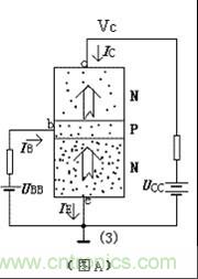 傳統講法一般分三步,以NPN型為例(以下所有討論皆以NPN型矽管為例),如示意圖A。1.發射區向基區注入電子;2.電子在基區的擴散與複合;3.集電區收集由基區擴散過來的電子。”(注1)
