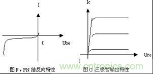 其實,從二極管PN的反向截止特性曲線上很容易看出,隻要將這個特性曲線轉過180度,如圖F所示,它的情形與三極管的輸出特性非常相似,三極管輸出特性如圖G所示。這說明了二極管與三極管在原理上存在著很必然的聯係。所以,在講解方法上選擇這樣的切入點,從PN結的偏狀態入手講三極管,就顯得非常合適。而且,這樣的講解會使問題變得淺顯易懂生動形象,前後內容之間自然和諧順理成章。