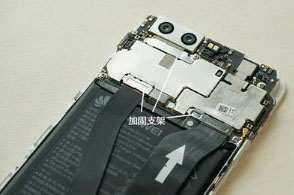 主板方麵,P10的所有屏蔽罩都使用了雙層可拆卸式屏蔽罩設計,方便維修,而屏蔽罩與主要芯片之間覆蓋了一層導熱矽脂。而一些BTB連接器接口附近的小元件(例如電容電阻)都上了膠,避免了不小心被刮掉的情況。