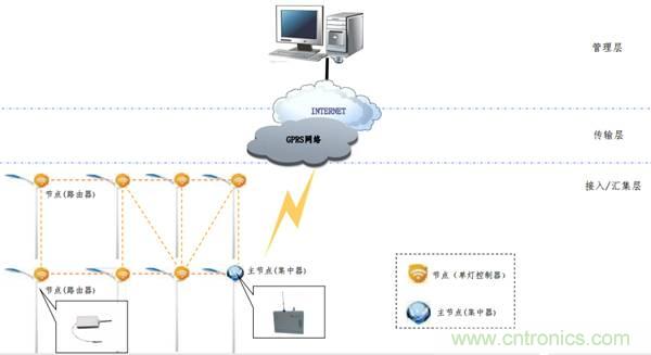 下行:通過zigbee無線方式和控製節點(單燈)通信;上行:通過GPRS等方式與監控中心通信;